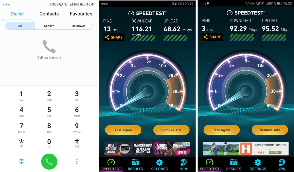 Svi tipovi povezivanja rade odlično kao što je i očekivano. Podržane su sve evropske 4G i 3G frekvencije i novi LTE Cat.12. Moguće je dostići velike LTE brzine, do 600/150mbps zavisno od lokacije i mreže, u mom slučaju maksimum je bio 116 mbps za download i 49 mbps za upload, više od ovoga verujem da nikome neće biti potrebno na telefonu. Prijem signala je očekivano dobar i zvuk sagovornika dovoljno kvalitetan i glasan. Neutralisanje pozadinskih zvukova pri razgovoru je uspešno. Ono što je zanimljivo je da se pri razgovoru iz slušalice odnosno zvučnika vibracija prenosi na poleđinu telefona, što ponekad zna da zasmeta ukoliko ne koristite neki oklop ili futrolu.